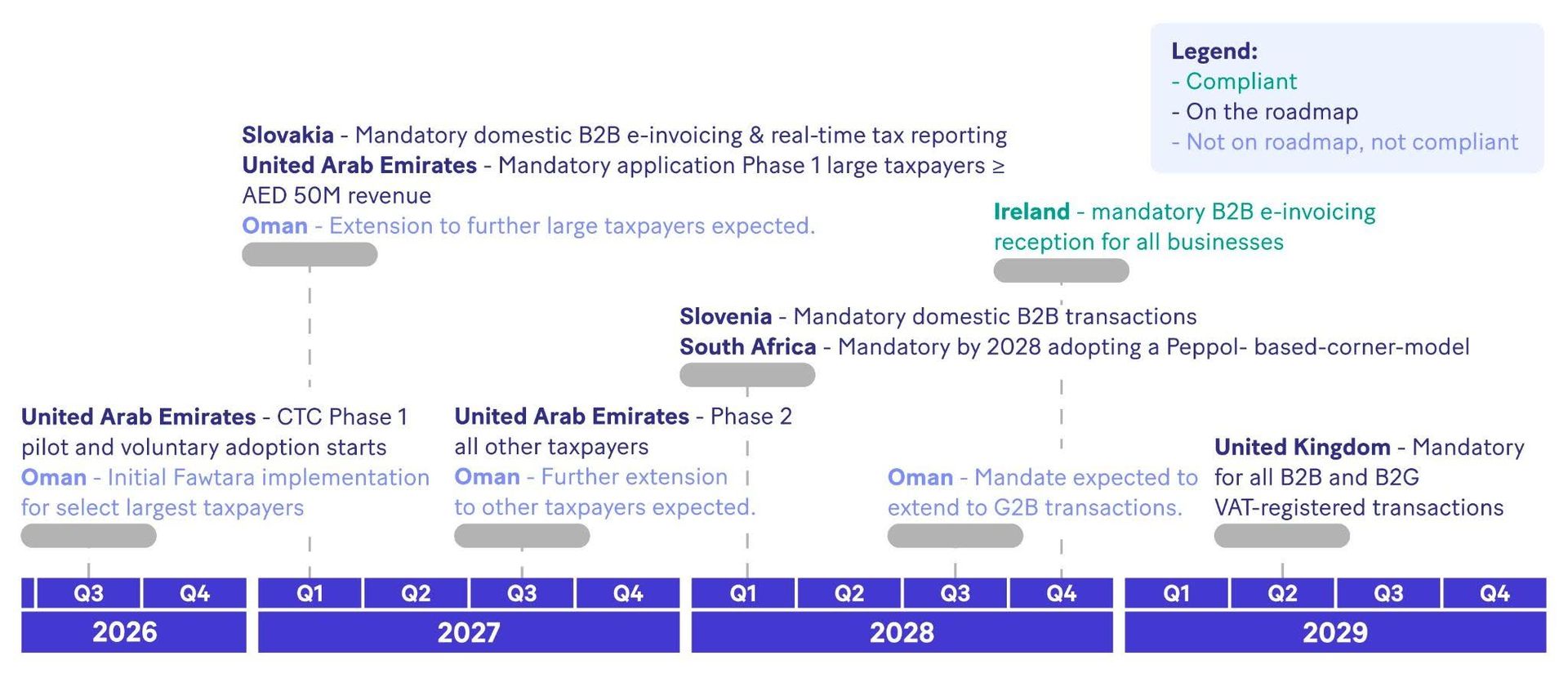 Die „Klasse von 2025“, insbesondere das Vereinigte Königreich, Irland, Slowenien und die Vereinigten Arabischen Emirate, bedeutet einen bemerkenswerten globalen Wandel. Durch die Bestätigung von Mandaten, die sich über mehrere Jahre in die Zukunft erstrecken, bieten diese Länder Unternehmen die langfristige Vorhersehbarkeit, die für substanzielle ERP und Überholungen des Finanzsystems. Die Verbreitung des Peppol/Dezentralisiert Modell in diesen Bestätigungen deutet auf einen wachsenden globalen Konsens hin, der die Steuertransparenz mit der Geschäftseffizienz in Einklang bringt.