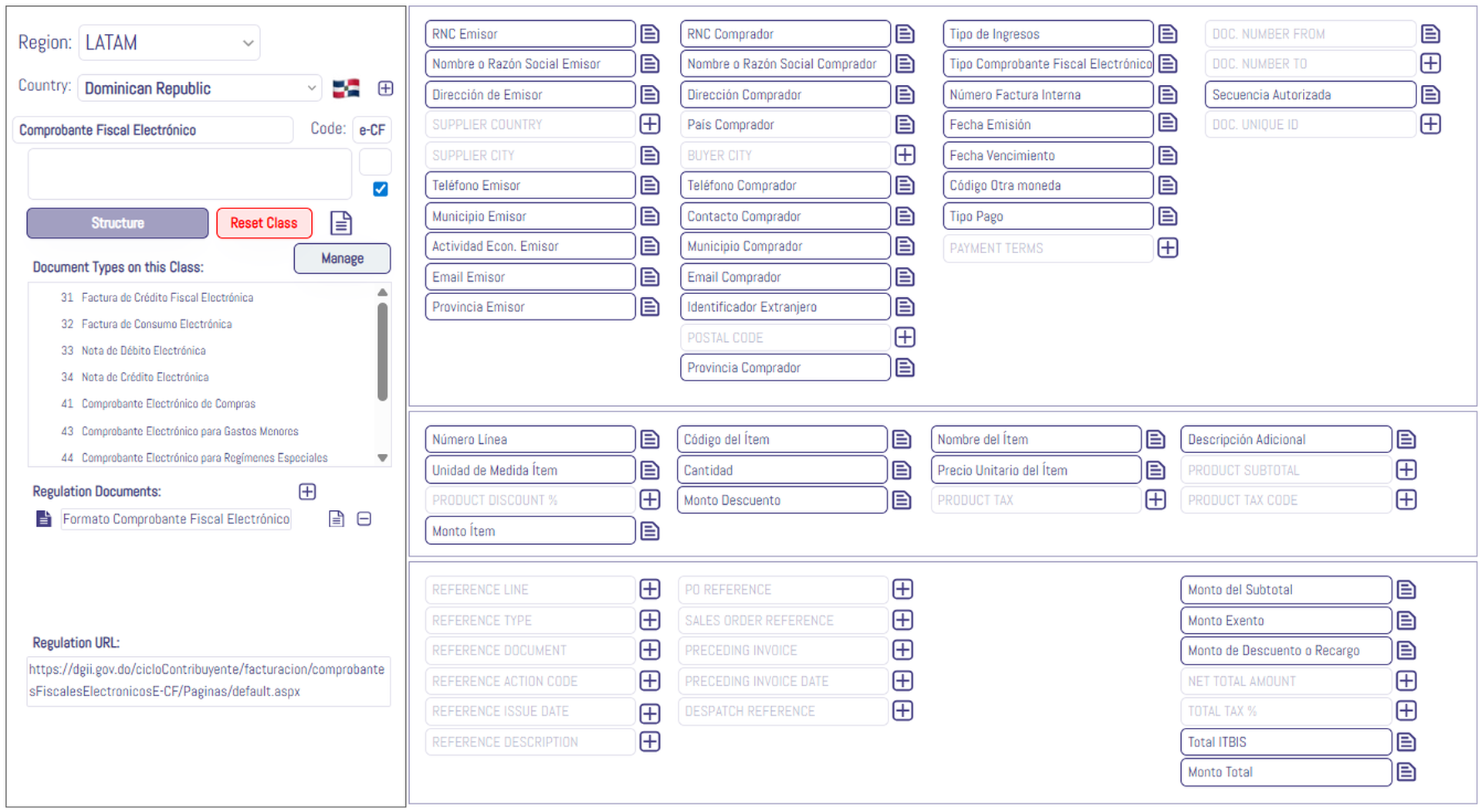 Le modèle défini par la DGII inclut tous les types de documents fiscaux en République dominicaine, et pas seulement les factures. Le format XML pour les factures électroniques est très bien défini et contient toutes les informations détaillant les transactions commerciales et leurs participants (fournisseur et acheteur).