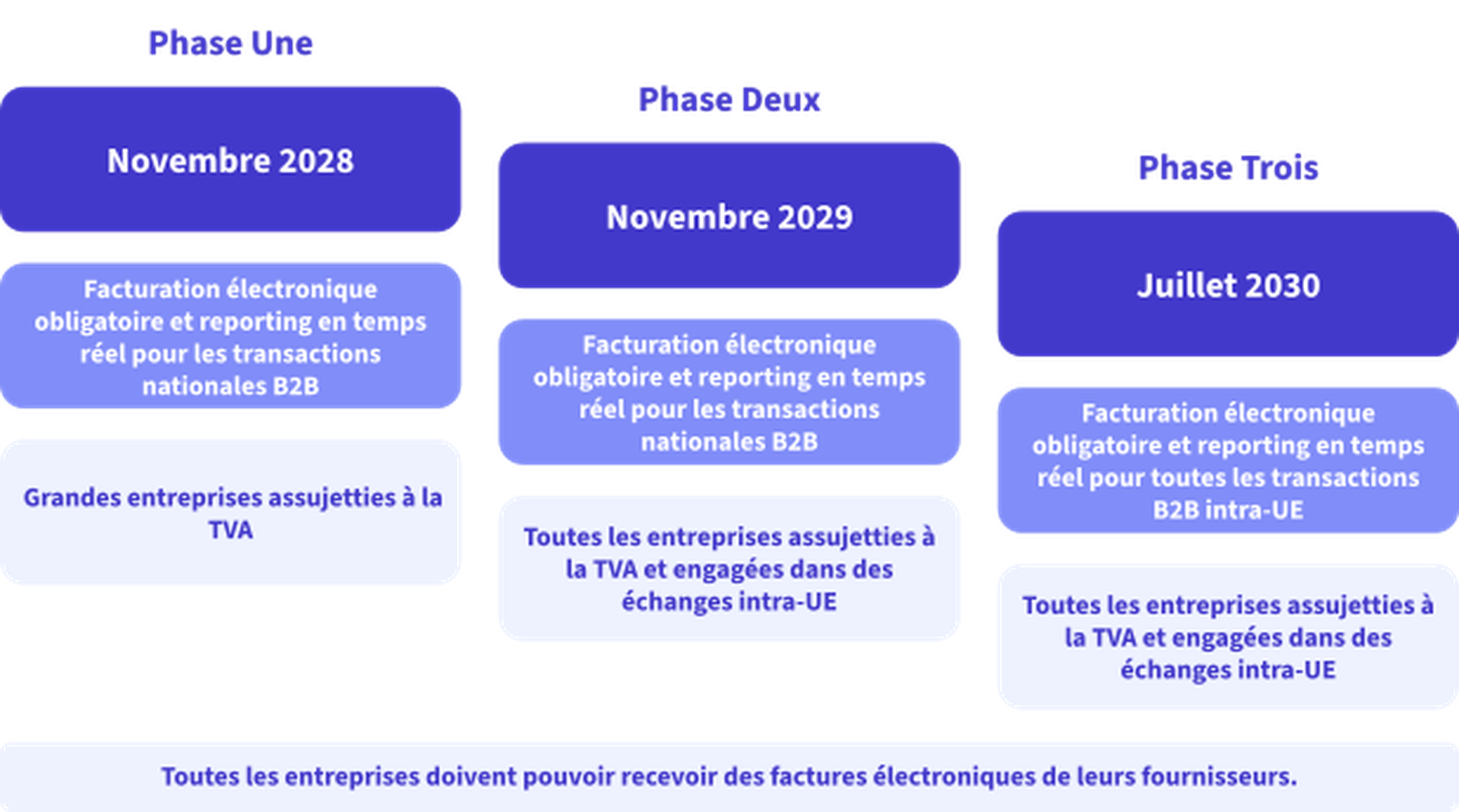 1. Phase 1 – Novembre 2028 : La facturation électronique obligatoire et le reporting en temps réel commencent pour les grandes entreprises enregistrées à la TVA impliquées dans des transactions B2B nationales. Crucialement, toutes les entreprises doivent être en mesure de recevoir des factures électroniques structurées à cette date. Cette phase affectera principalement un petit nombre d'entreprises qui sont bien placées pour s'adapter aux changements numériques et ont souvent une expérience internationale existante avec des systèmes similaires.
