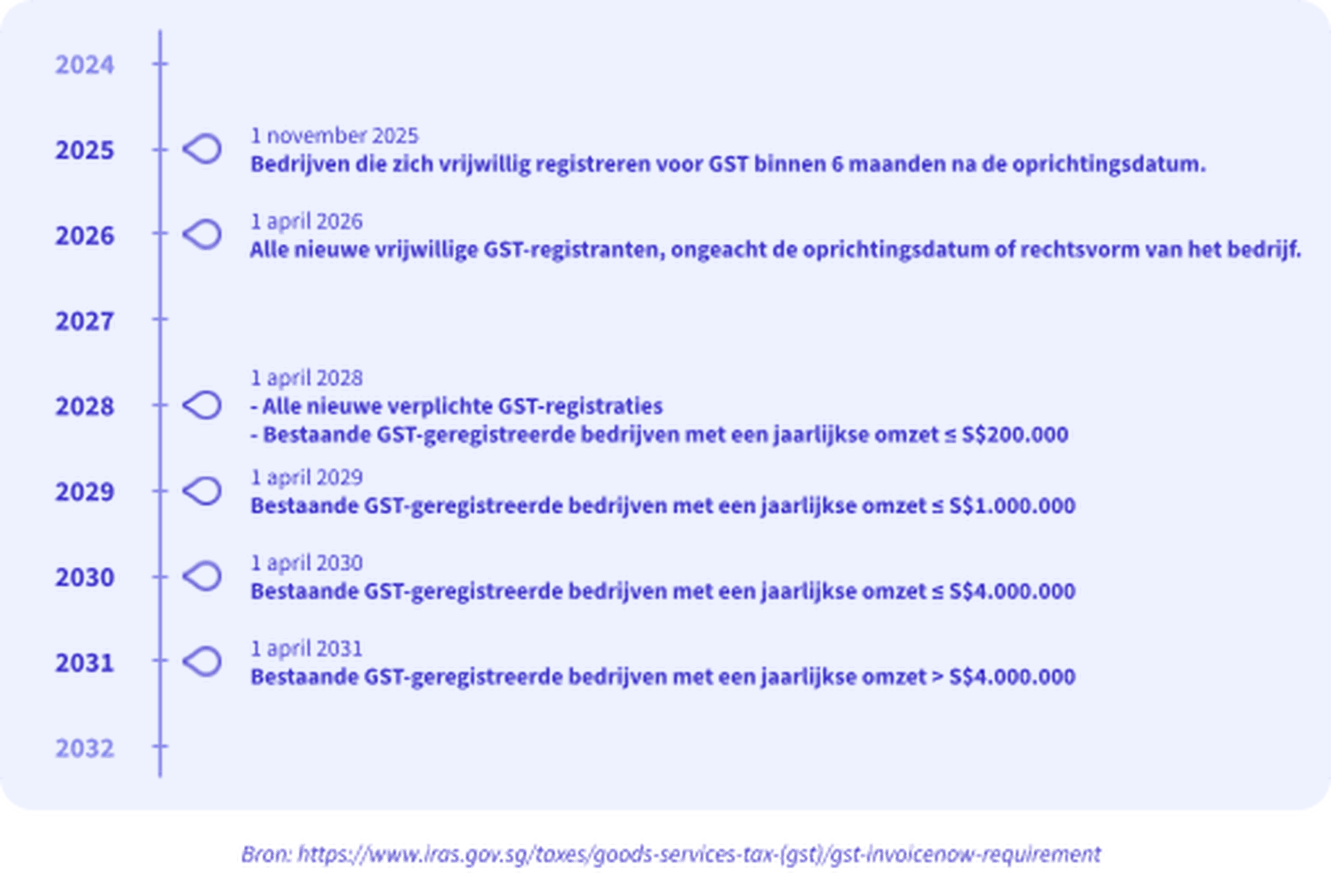 Vanaf november 2025 moeten nieuw opgerichte bedrijven die kiezen voor GST-registratie InvoiceNow gebruiken om factuurgegevens rechtstreeks naar de IRAS te sturen voor de belastingadministratie. Tegen april 2026 zullen alle nieuw geregistreerde GST-bedrijven, of dit nu vrijwillig of verplicht is, hier ook gebruik van maken. Deze gefaseerde aanpak zorgt voor een soepele overgang en stelt bedrijven in staat om effectief aan hun belastingverplichtingen te voldoen.