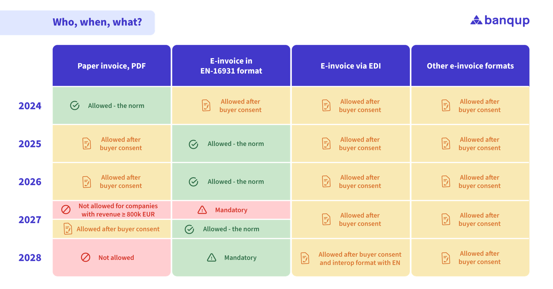 Vanaf 1 januari 2027: Bedrijven met een omzet in het voorgaande jaar (2026) van € 800.000 of meer moeten e-facturen uitreiken in EN 16931 of andere overeengekomen elektronische formaten waaruit btw-informatie nauwkeurig kan worden gehaald. EDI blijft toegestaan mits de btw-informatie kan worden geëxtraheerd in EN 16931. Voor bedrijven die op dat moment onder de regelgeving vallen, zijn papieren facturen niet langer toegestaan.
