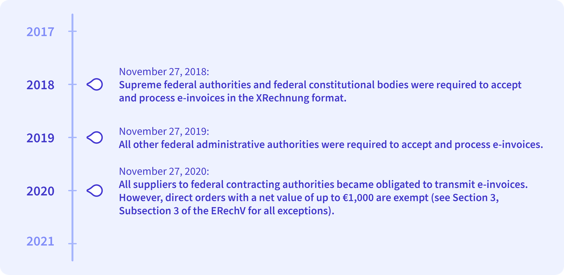 27 november 2018: Hoogste federale autoriteiten en federale constitutionele organen waren verplicht om e-facturen in het XRechnung-formaat te accepteren en te verwerken.