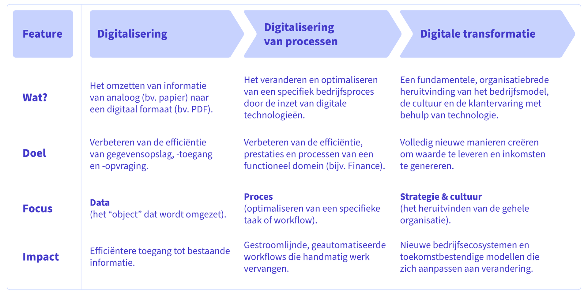 Digitale transformatie is de meest uitgebreide term en staat voor een strategische, organisatiebrede heruitvinding waarbij digitale technologieën fundamenteel veranderen hoe bedrijven opereren, waarde leveren en klanten betrekken. Terwijl, zoals hierboven uitgelegd, digitization papieren/formulieren omzet naar digitale bestanden en digitalization individuele processen automatiseert (zoals e-facturatie), vraagt digitale transformatie: “Hoe kan technologie volledig nieuwe manieren van waardecreatie mogelijk maken?”